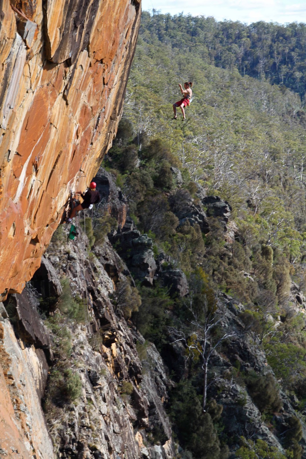 Forty years on and a renaissance has occurred at Bare Rock. Using expansion bolts as protection on the severely overhanging faces, some of the hardest routes in Tasmania are being established. Some of the climbs are so hard that it sometimes takes dozens of attempts before a first ascent can be chalked up. It is absolutely normal to see climbers flying into space, as some of these photographs show.